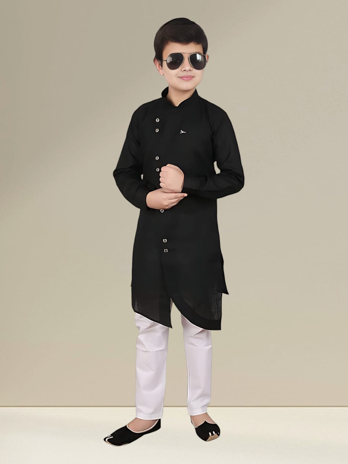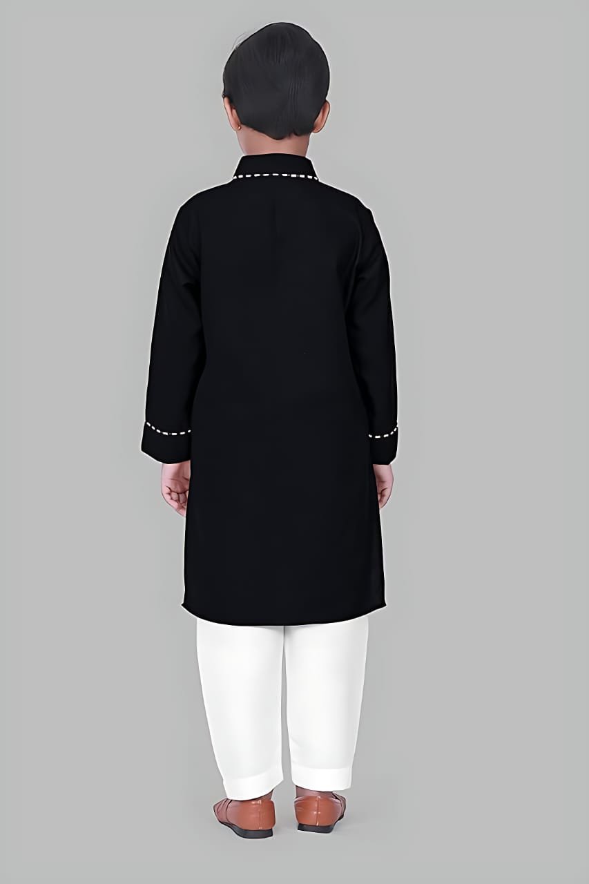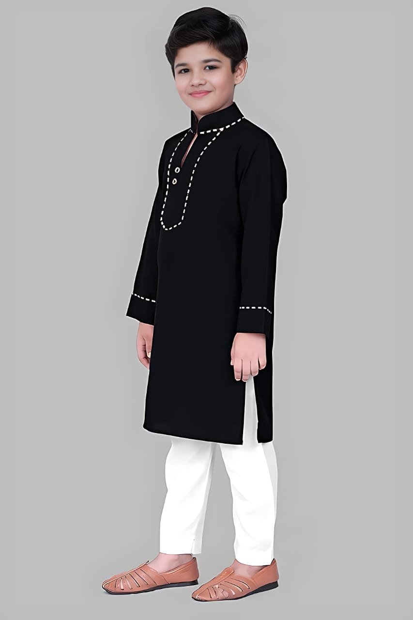 Elegant Boys’ Black Kurta Pyjama Set with Straight Collar and Piping Design—crafted from premium cotton fabric for comfort and style. Ideal for weddings, festivals, and parties. Classy ethnic wear with a modern touch and free home delivery from Zircon E-Shop.