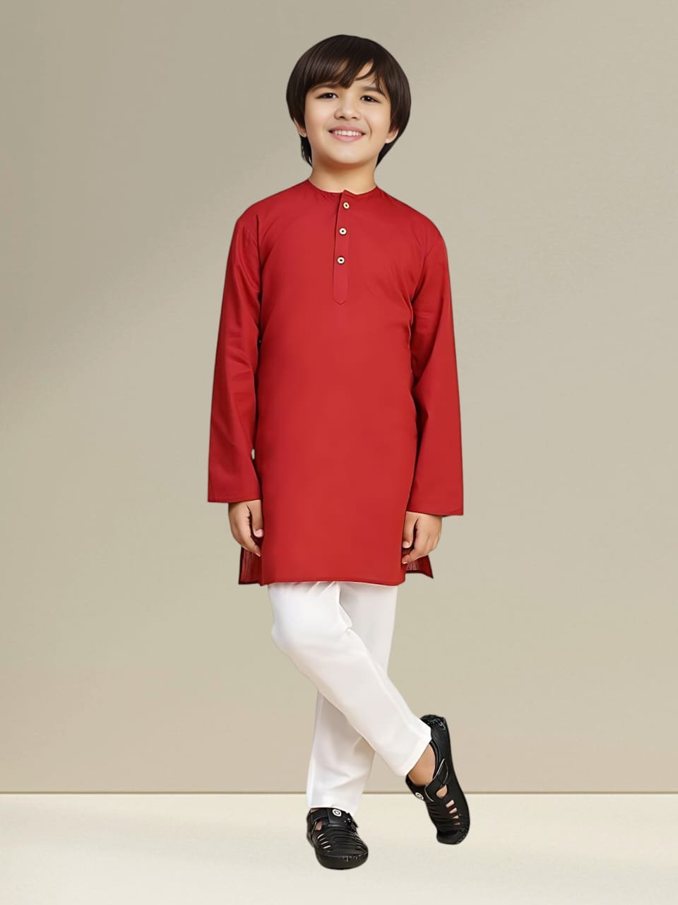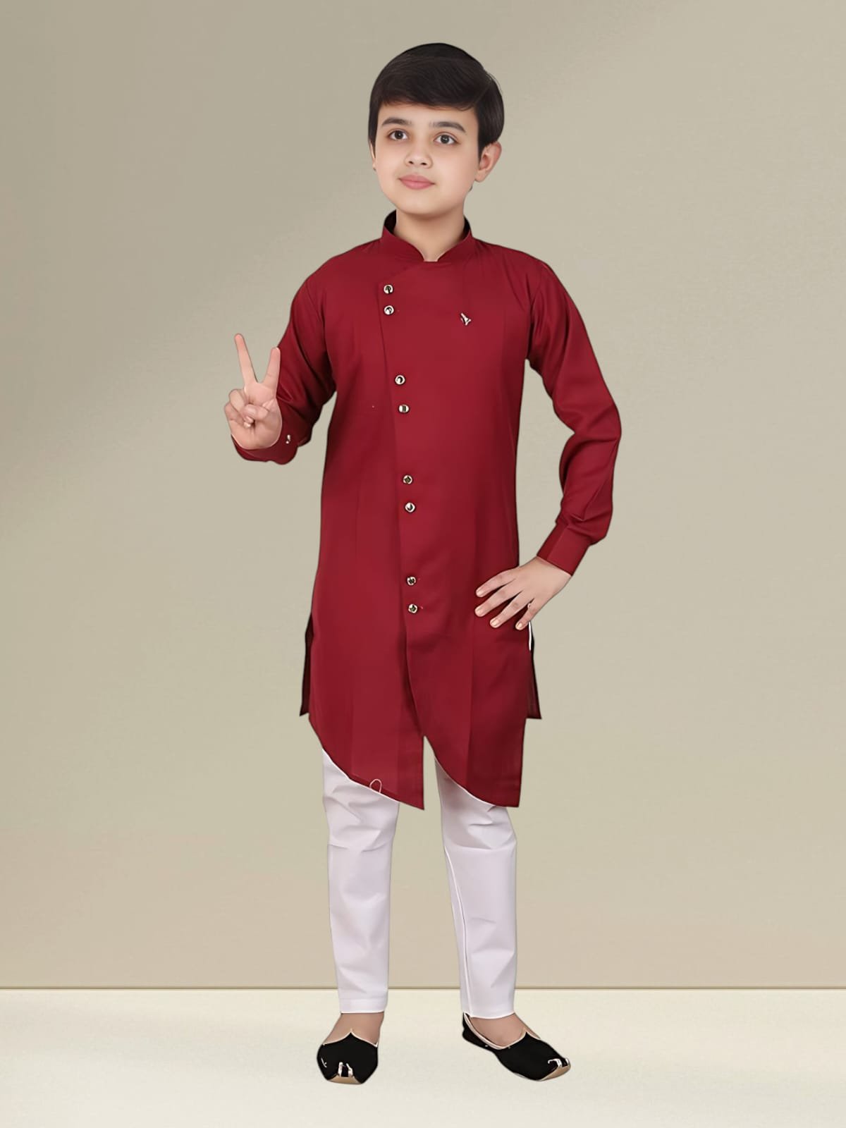 Graceful Boys’ Maroon Kurta Pyjama with Straight Collar and Piping Design—made from premium-quality cotton fabric for comfort and style. Perfect festive and wedding wear for boys aged 1–10 years. Elegant, traditional, and delivered with free home delivery only on Zircon E-Shop.