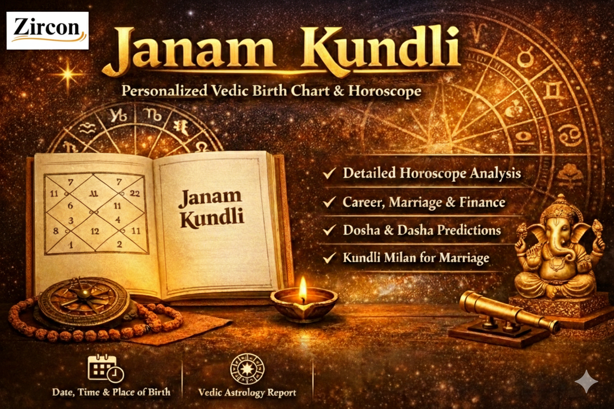 Discover the deeper insights of your life with a professionally prepared Janam Kundli (Vedic Birth Chart) from Zircon E-Shop. Created using your date, time, and place of birth, this detailed horoscope report follows authentic Vedic astrology principles to provide accurate planetary positions and life predictions.