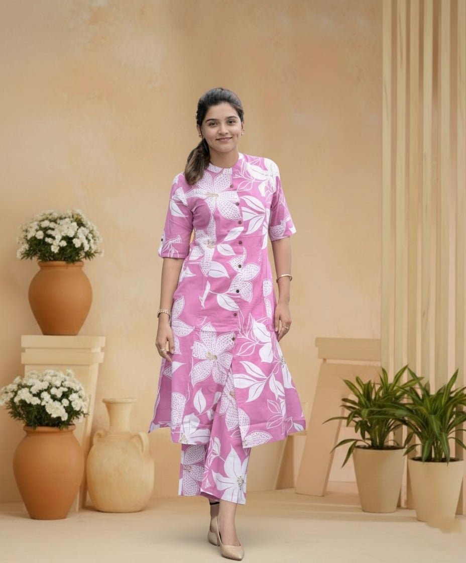 The kurti features a stylish Mandarin (Chinese) collar with a button-down front, offering a smart and polished silhouette. Paired with matching floral palazzo pants, this set ensures maximum comfort, easy movement, and a relaxed yet structured fit. The wide-leg palazzo adds a modern touch while keeping the outfit airy and elegant.