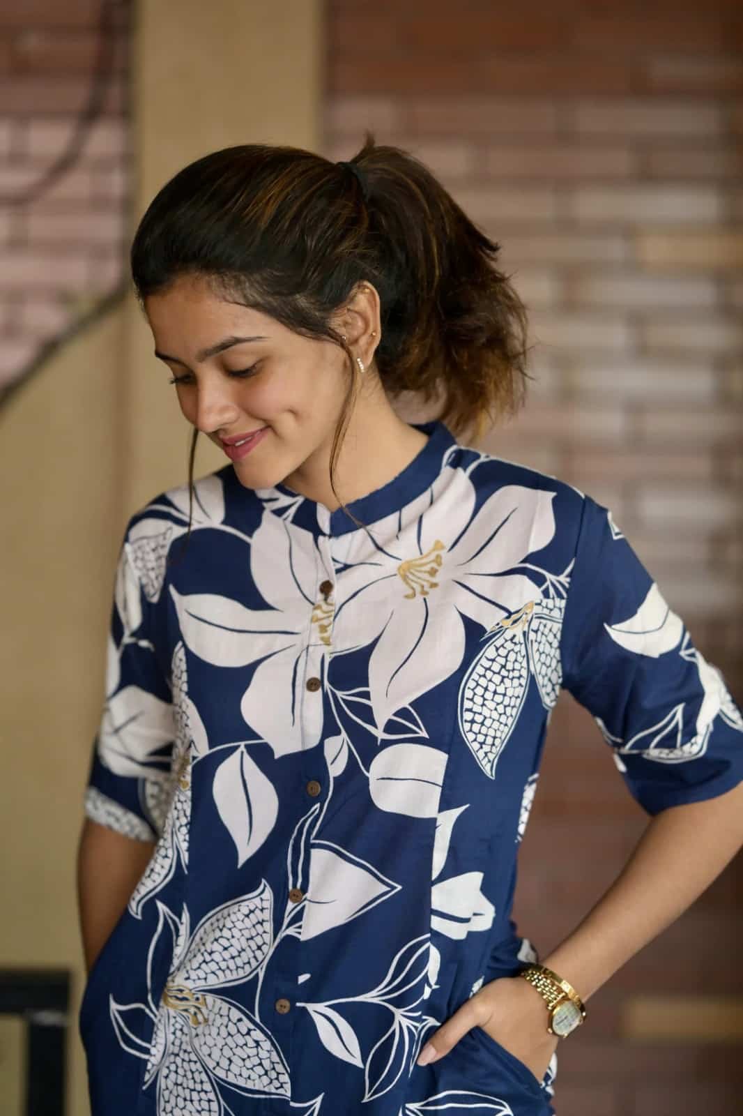 Crafted from 100% premium breathable cotton, the fabric feels ultra-soft on the skin, lightweight, and ideal for summer and all-day wear. The beautiful royal blue base enhanced with vibrant floral prints gives a fresh, soothing, and stylish look suitable for every age group.